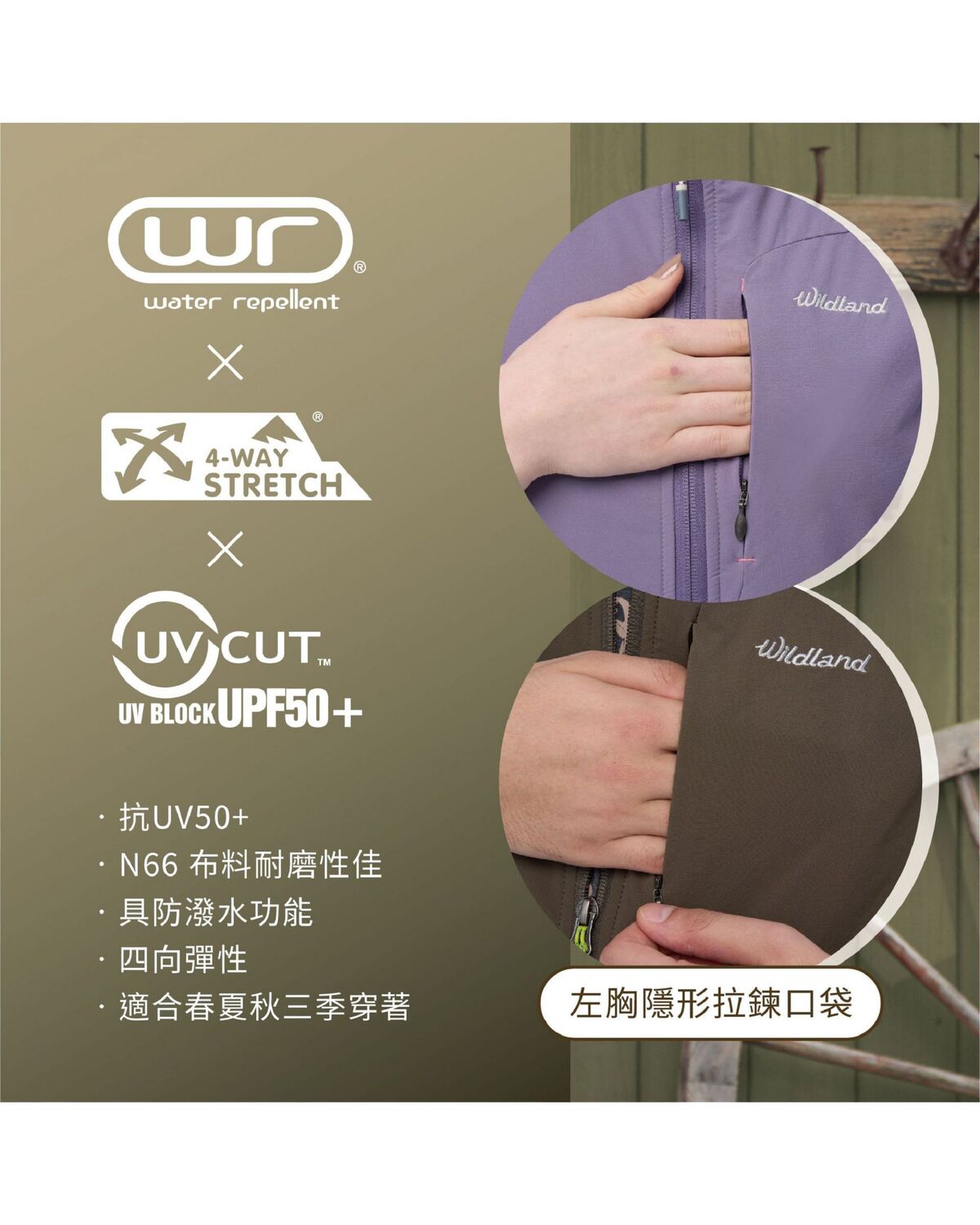 • 左胸隱形拉鍊口袋,前下兩側拉鍊口袋