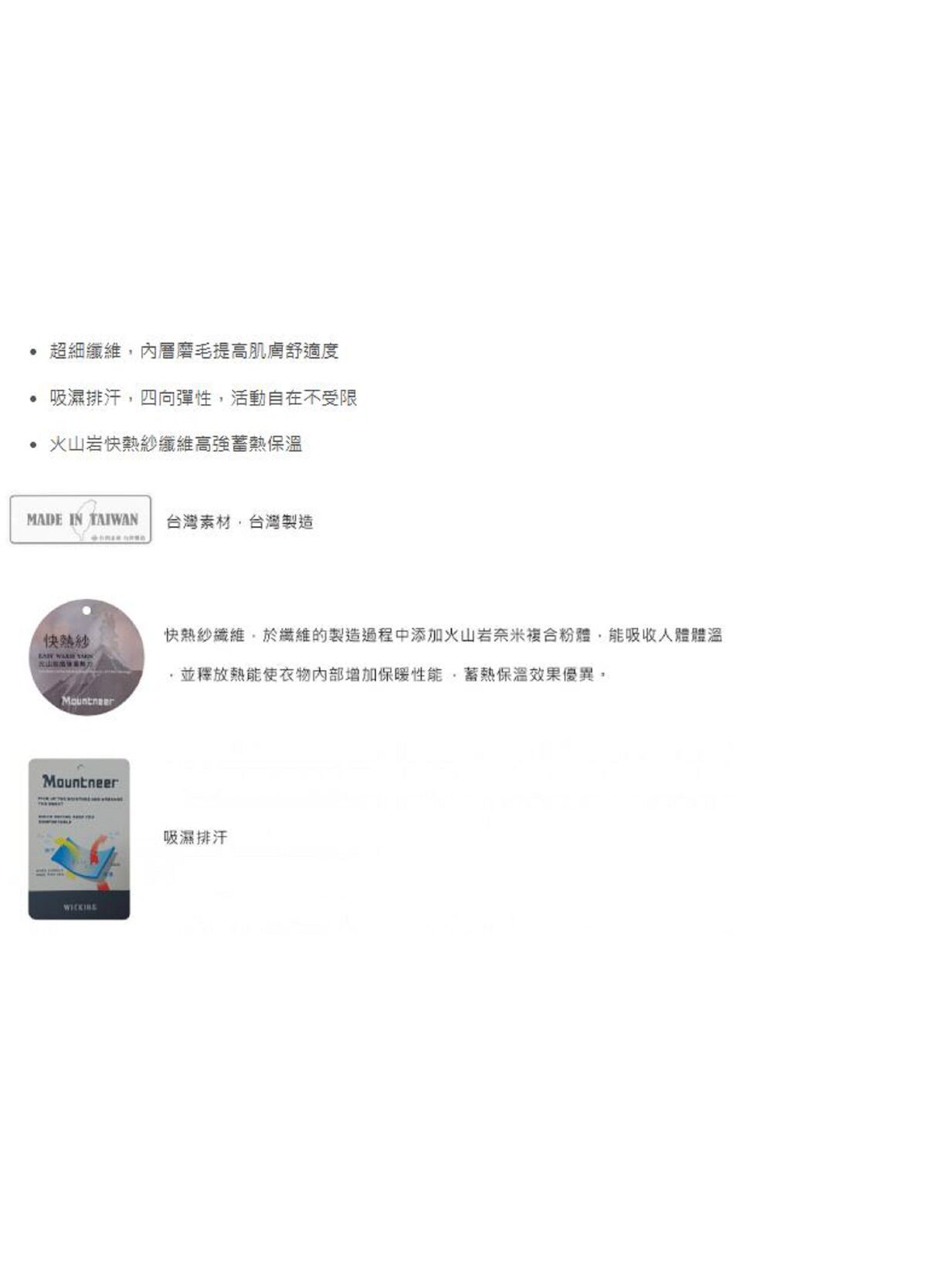 **採用台灣製造之華楙快熱紗纖維,於纖維的製造過程中添加火山岩奈米複合粉體,能吸收人體體溫,並釋放熱能使衣物內部增加保暖性能,蓄熱保溫效果優異**