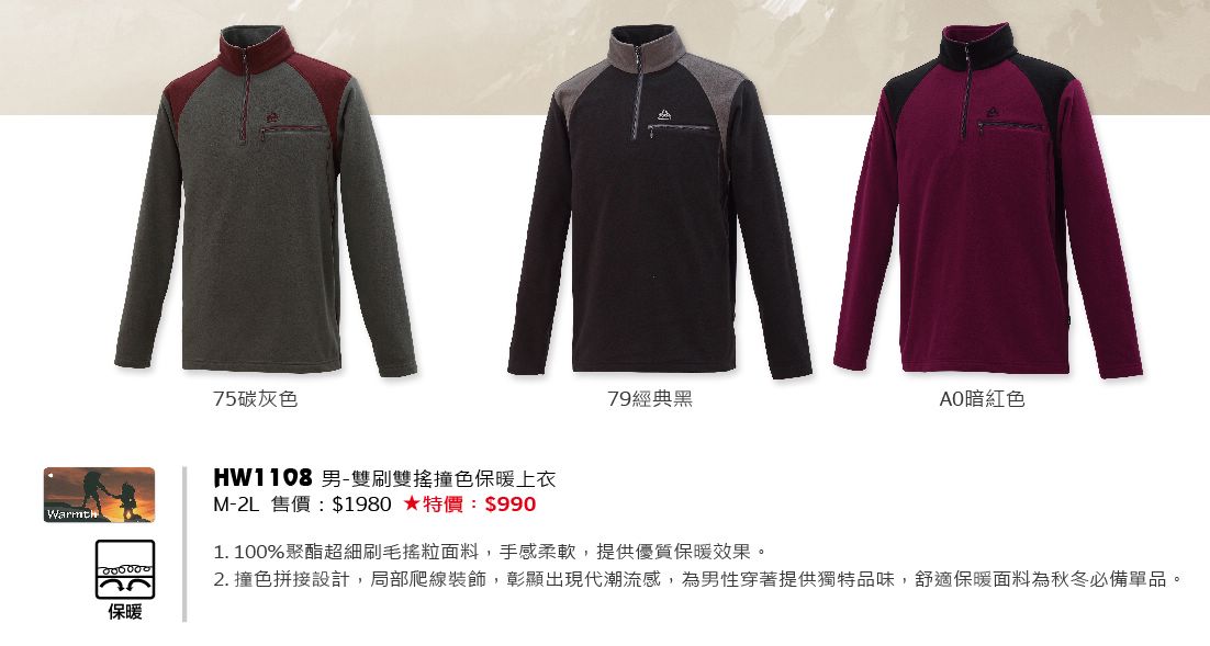 > 男-雙刷雙搖撞色保暖上衣